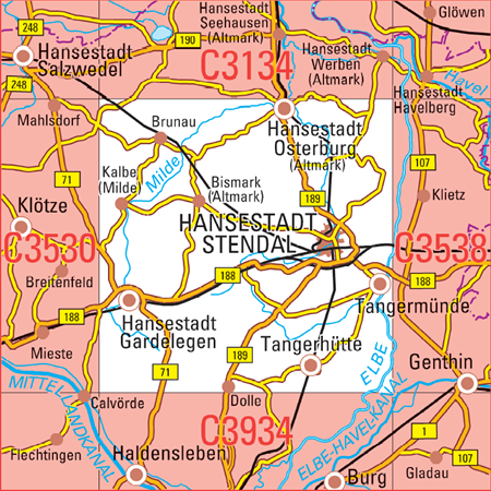 Maßstab 1:100 000, Nomenklatur: C3534, Name des Kartenblatts: Hansestadt Stendal, Auflagejahr: 2024, Blattschnitt: Normalblattschnitt (Preußische Landesaufnahme), Gradabteilungskarte mit 40 min geographischer Länge und 24 min geographischer Breite, Geodätischer Raumbezug: ...